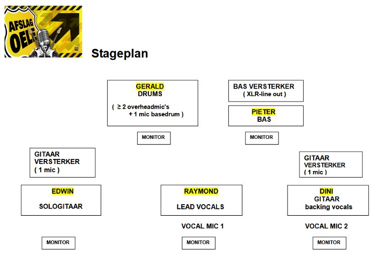 geluidsapparatuur voor een kleine zaal. Veel liever werken we echter met John, onze professionele geluidsman met dito apparatuur. Ons podium is bij voorkeur 7 x 4 meter groot, minimaal 6 x 3,5 meter.